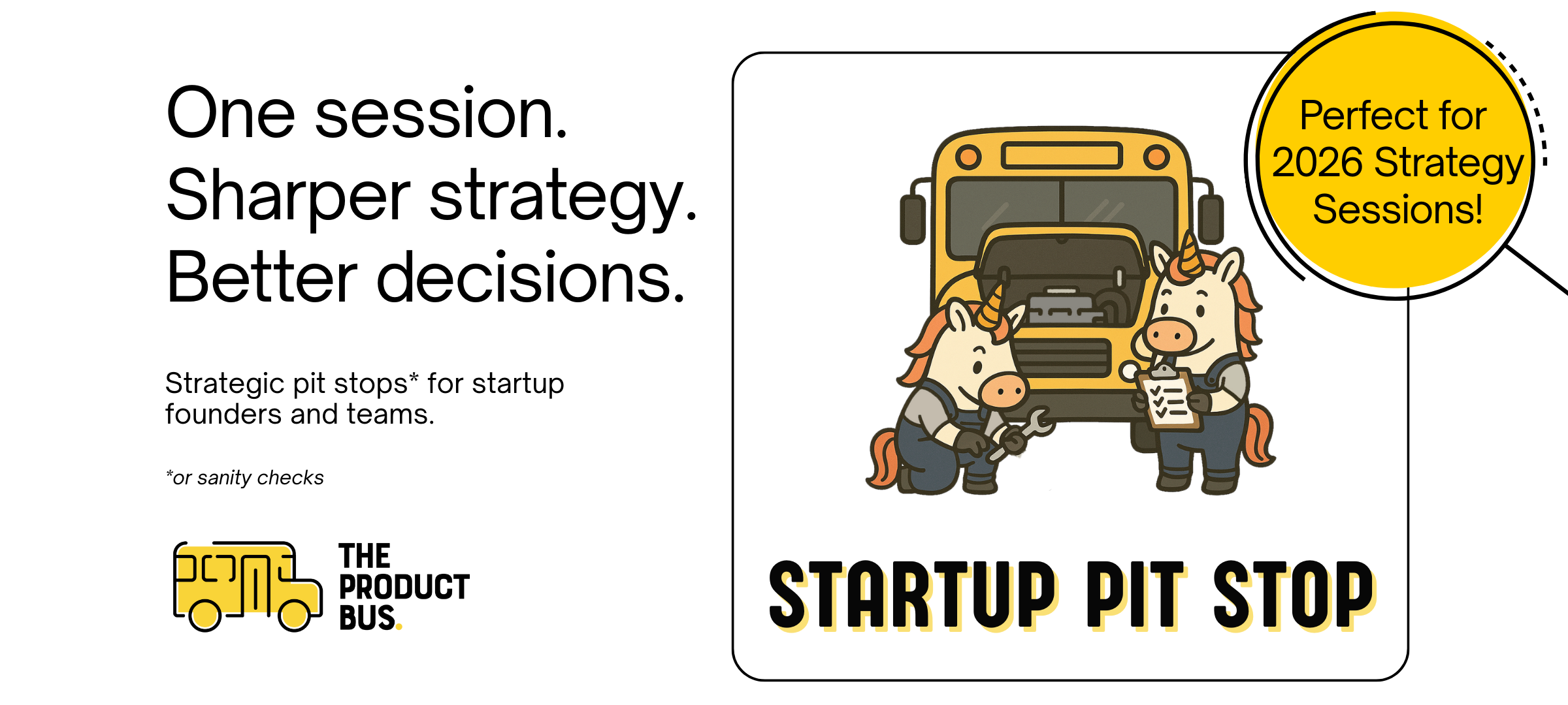 The Product Bus Startup Pit Stop is a focused strategy session for founders who need clarity before their next move.